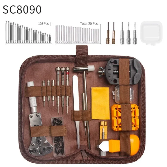 Includes openers, pin removers, tweezers, screwdrivers, and more — covering most watch repair needs.
